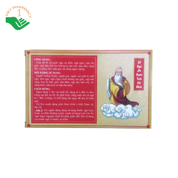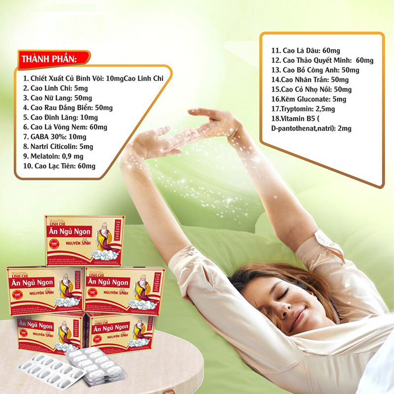 Mỗi hộp sản phẩm bao gồm 3 vỉ, mỗi vỉ có 10 viên nang tiện lợi. Khuyến cáo sử dụng 2 đến 4 viên vào buổi tối, sau khi ăn tối khoảng 30 phút hoặc trước khi đi ngủ từ 1 đến 2 tiếng. Thành phần chính bao gồm chiết xuất củ Bình Vôi, nấm linh chi và cao nữ lang, giúp cải thiện tình trạng căng thẳng, mất ngủ, nâng cao sức đề kháng.