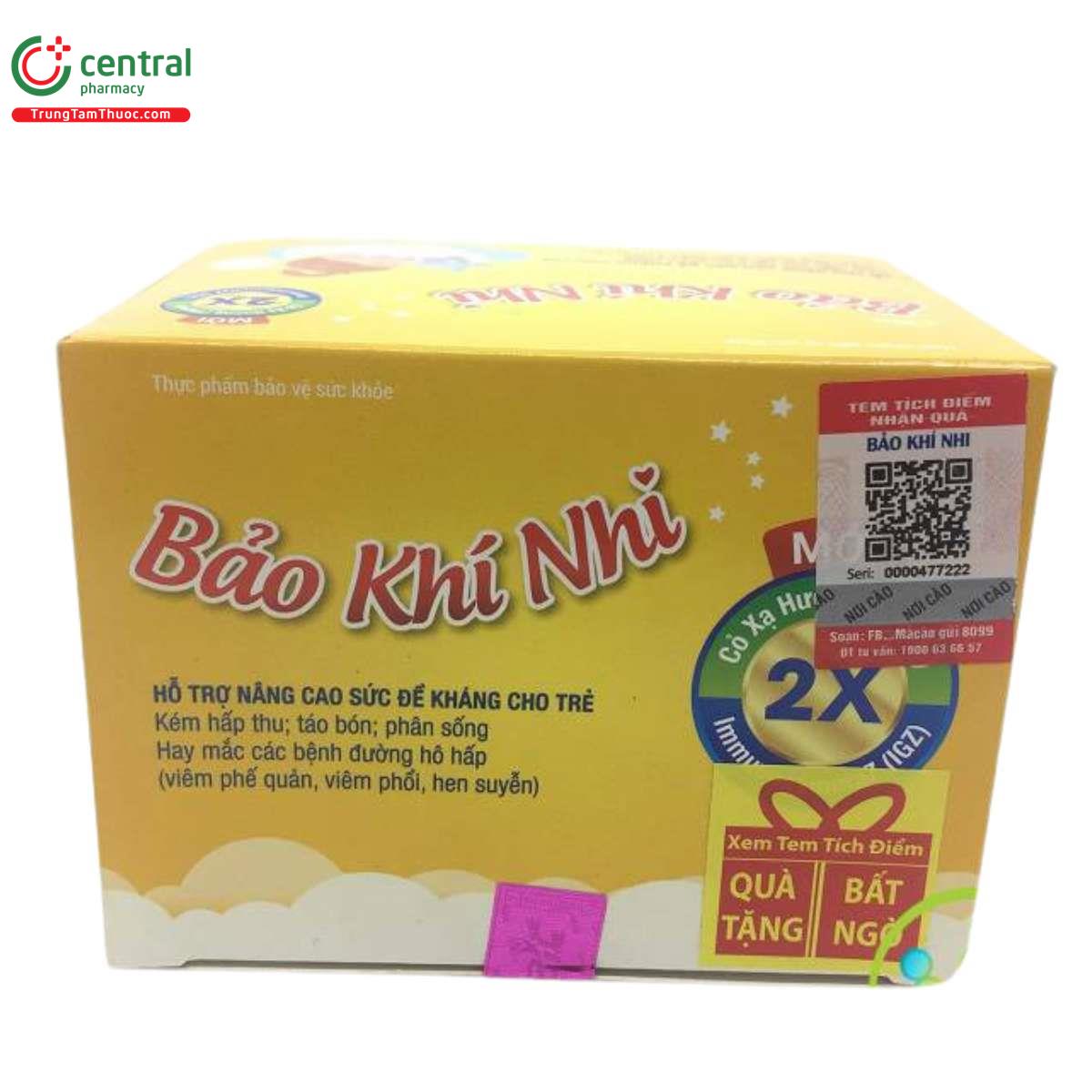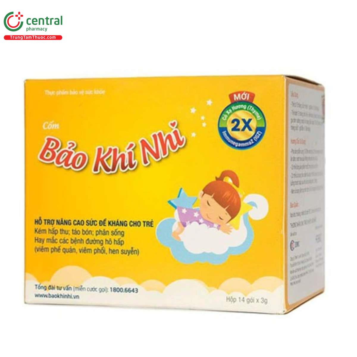 Bảo Khí Nhi là thực phẩm chức năng dạng cốm rất hữu ích cho trẻ nhỏ, giúp tăng cường sức khỏe đường hô hấp và tiêu hóa. Với 14 gói tiện lợi, sản phẩm hỗ trợ bé ăn ngon, tăng cân và cải thiện tình trạng hấp thu dinh dưỡng. Không chỉ giúp trẻ phát triển thể chất, Bảo Khí Nhi còn giúp giảm tình trạng rối loạn tiêu hóa như táo bón, tiêu chảy và phân sống.