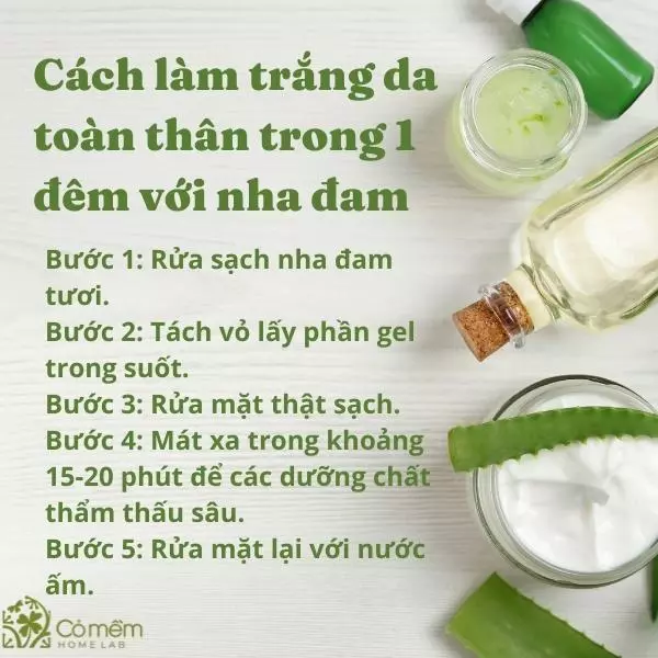 Nếu bạn đang tìm kiếm cách làm trắng da body tại nhà, nha đam là một nguyên liệu tuyệt vời. Đầu tiên, bạn hãy rửa sạch nhánh nha đam tươi, gọt bỏ vỏ và lấy phần gel trong suốt bên trong. Sau khi rửa lại với nước, bạn có thể thoa trực tiếp gel lên da, massage nhẹ nhàng để tăng cường hiệu quả hấp thụ.