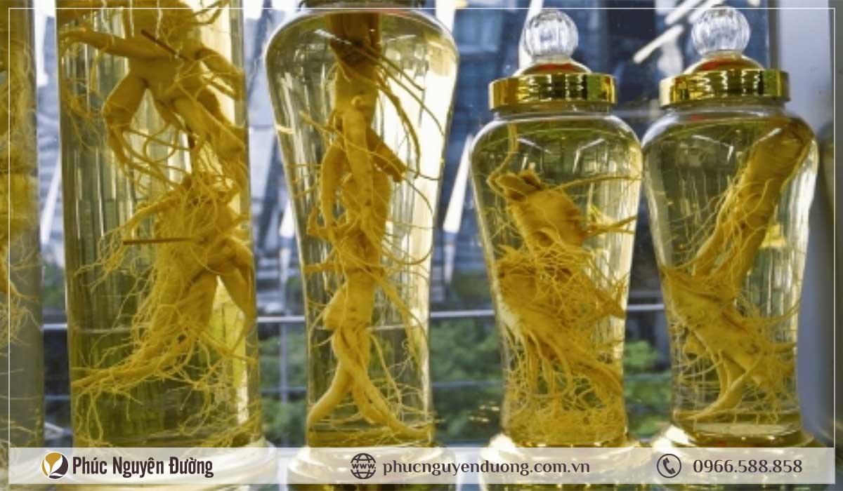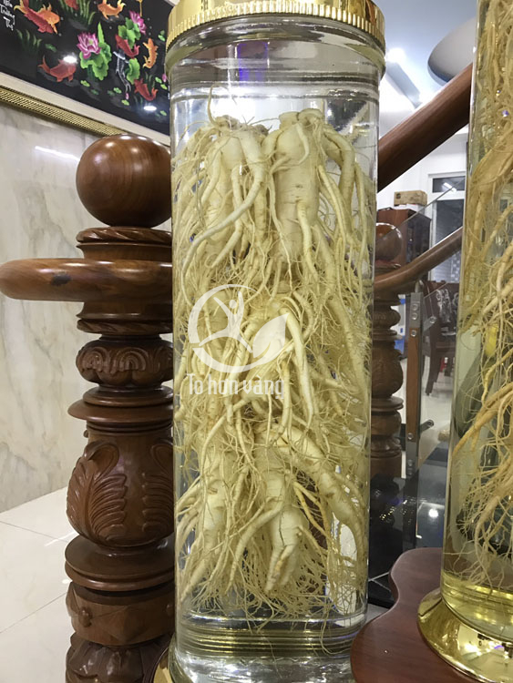 Tiếp theo, cho nhân sâm vào bình thuỷ tinh sạch và khô. Đổ rượu trắng vào bình sao cho ngập qua mặt sâm, tỷ lệ lý tưởng là 1 kg sâm tươi tương ứng với 10 lít rượu. Để bình ngâm ở nơi thoáng mát, tránh ánh nắng trực tiếp.