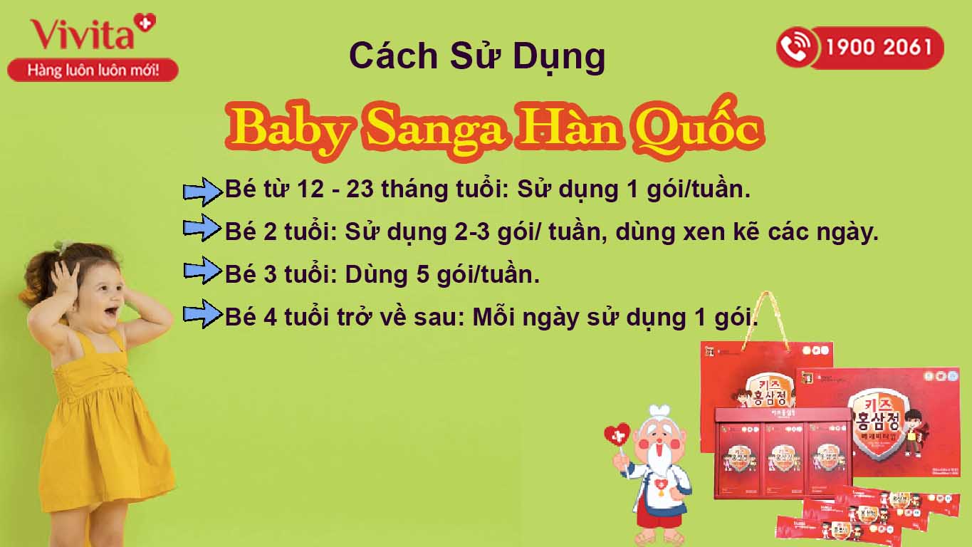 Hồng sâm Baby SangA là sản phẩm bổ dưỡng rất tốt cho trẻ em từ 5 tuổi trở lên. Đối với trẻ trong độ tuổi này, mỗi ngày bé chỉ cần sử dụng 1 gói hồng sâm. Lưu ý, thời điểm tốt nhất để dùng sản phẩm là vào buổi sáng, sau khi ăn khoảng 1 giờ. Việc này giúp bé dễ dàng hấp thu các chất dinh dưỡng có trong hồng sâm.