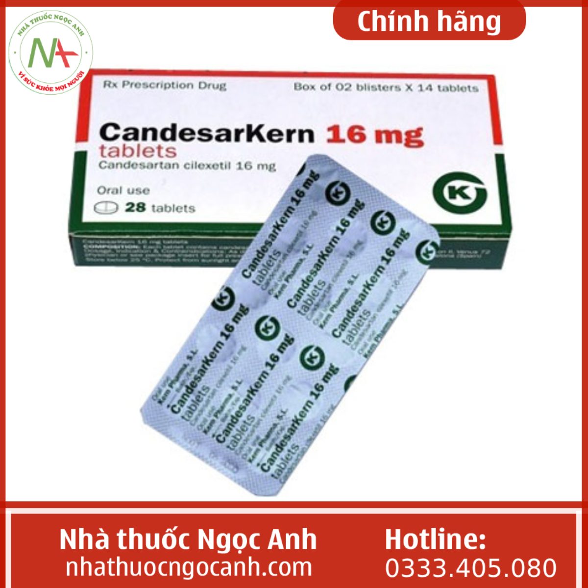 Candekern 16mg là thuốc được sản xuất bởi Kern Pharma, một thương hiệu nổi tiếng đến từ Tây Ban Nha. Với thành phần chính là Candesartan cilexetil 16mg, thuốc này được chỉ định điều trị tăng huyết áp nguyên phát cho người trưởng thành. Candekern giúp giảm sức cản ngoại vi toàn thân, từ đó làm giảm huyết áp động mạch hiệu quả.