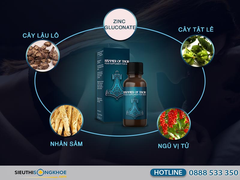 Hammer of Thor là một sản phẩm có xuất xứ từ Nga với những thành phần chủ yếu như Acid L-ascorbic, bạch tật lê, nhân sâm, zinc gluconate, cây lậu lô và ngũ vị tử. Những thành phần này không chỉ giúp tăng cường sinh lý nam mà còn hỗ trợ cải thiện các vấn đề như rối loạn cương dương và xuất tinh sớm.