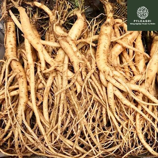 Rễ cây Sâm dây Ngọc Linh có hình dáng đặc trưng, thường mọc thẳng xuống đất và có dạng trụ dài. Rễ củ này thường có màu trắng ngà với kích thước thay đổi tùy thuộc vào tuổi cây và điều kiện sinh trưởng. Khi nhìn gần, bạn sẽ thấy các rễ củ có lớp vỏ ngoài hơi nhẵn, lớp lõi bên trong có màu vàng nhạt, mật độ nạc và chắc chắn, mang đến cảm giác mạnh mẽ.