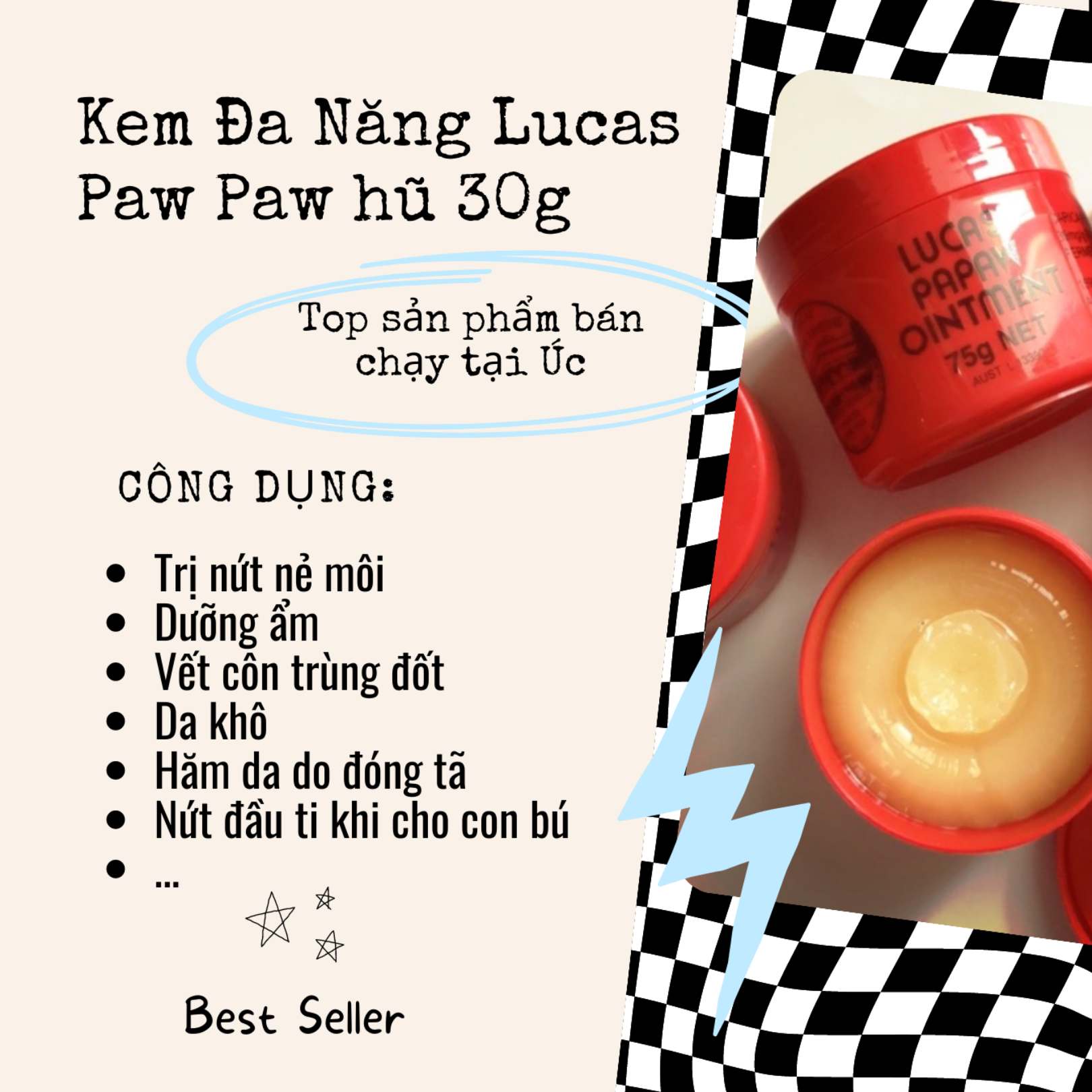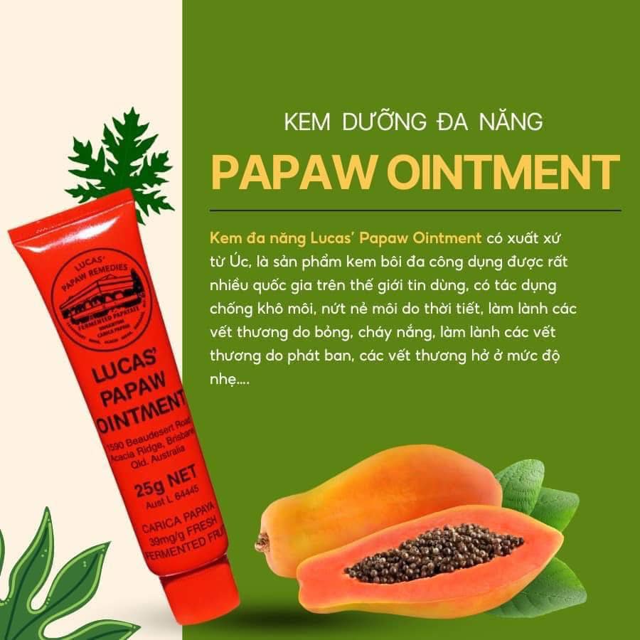 Kem dưỡng đa năng Lucas Papaw Ointment được nhiều chuyên gia khuyến cáo sử dụng cho các vấn đề về da như khô, nứt nẻ, và cháy nắng. Với thành phần chiết xuất từ đu đủ thiên nhiên, sản phẩm này không chỉ giúp dưỡng ẩm mà còn mang đến cảm giác nhẹ nhàng, thoải mái trên da.