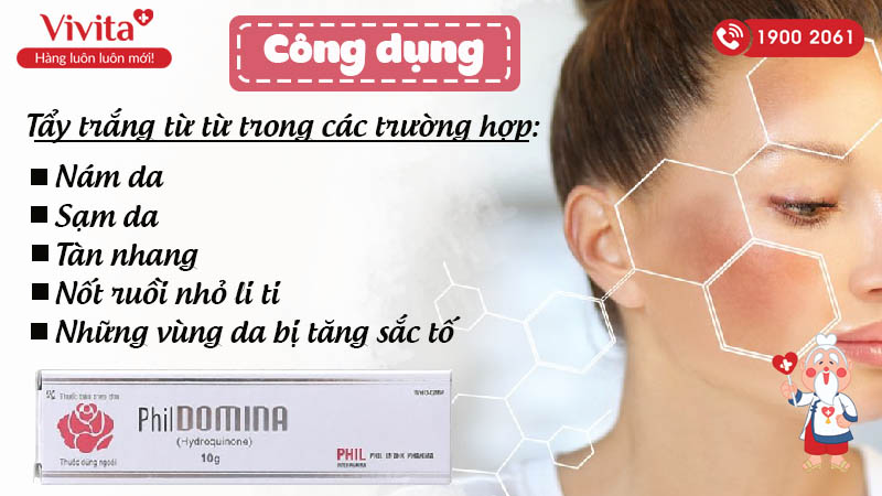 Phildomina là một sản phẩm nổi bật trong việc điều trị các vấn đề về sắc tố da, đặc biệt là nám, tàn nhang và vết sạm. Với thành phần chính là Hydroquinone, thuốc bôi này giúp ức chế sự sản sinh melanin, nhằm làm giảm tình trạng tăng sắc tố trên da.