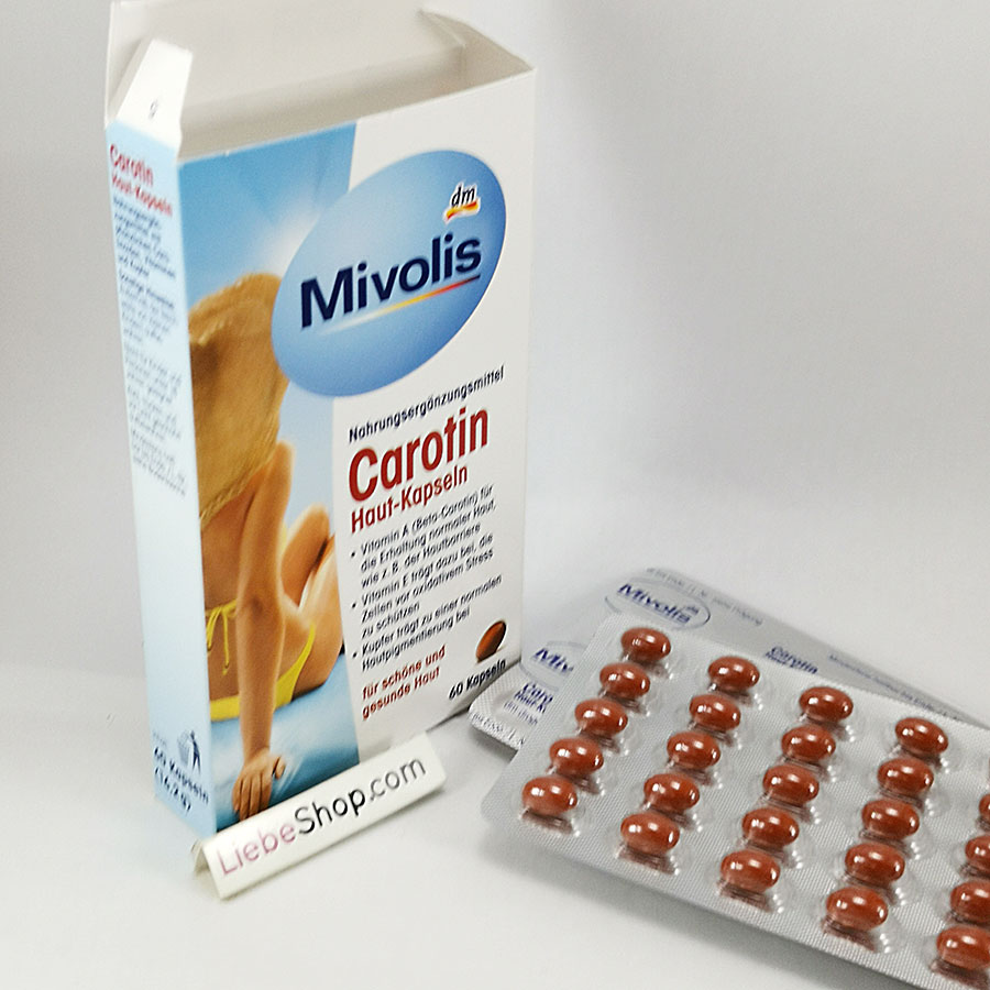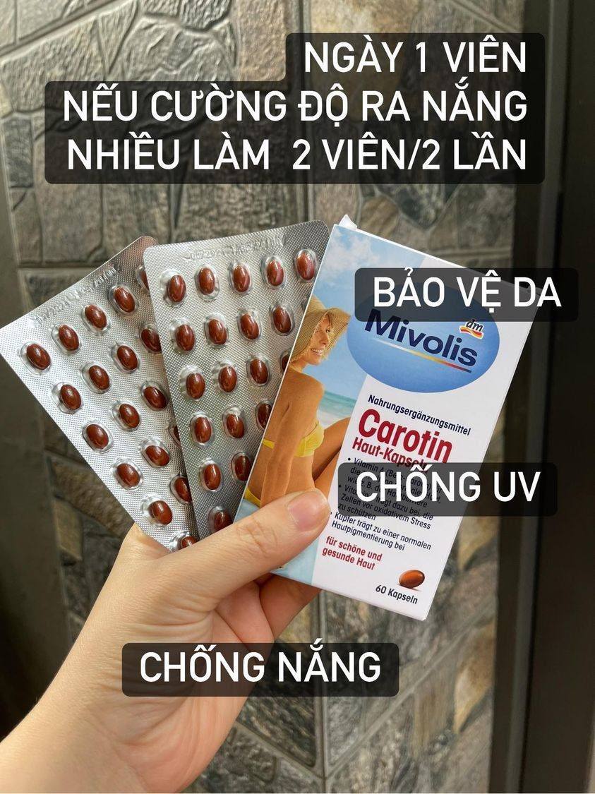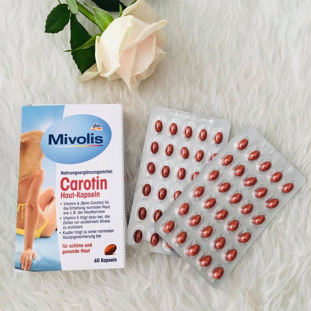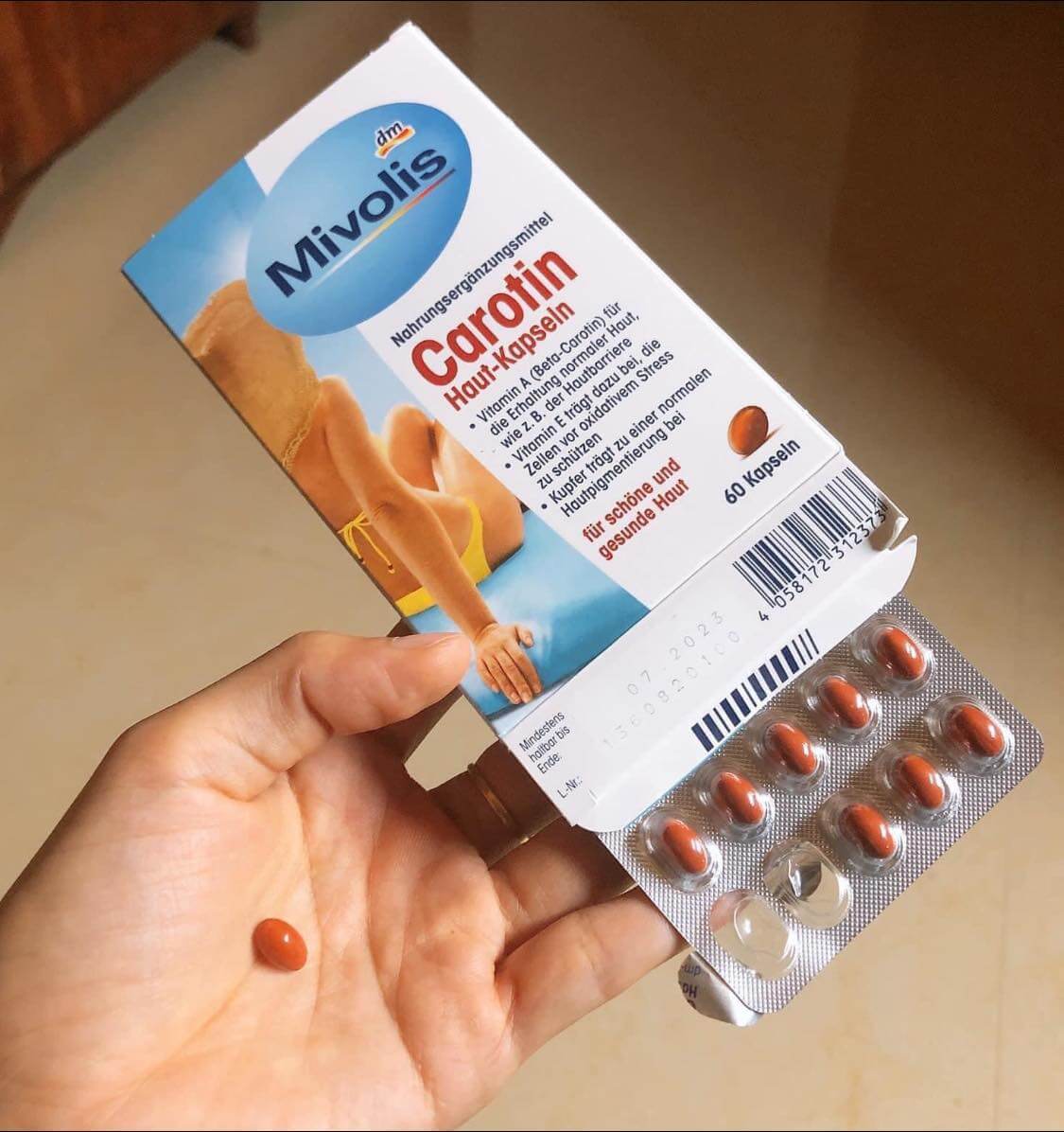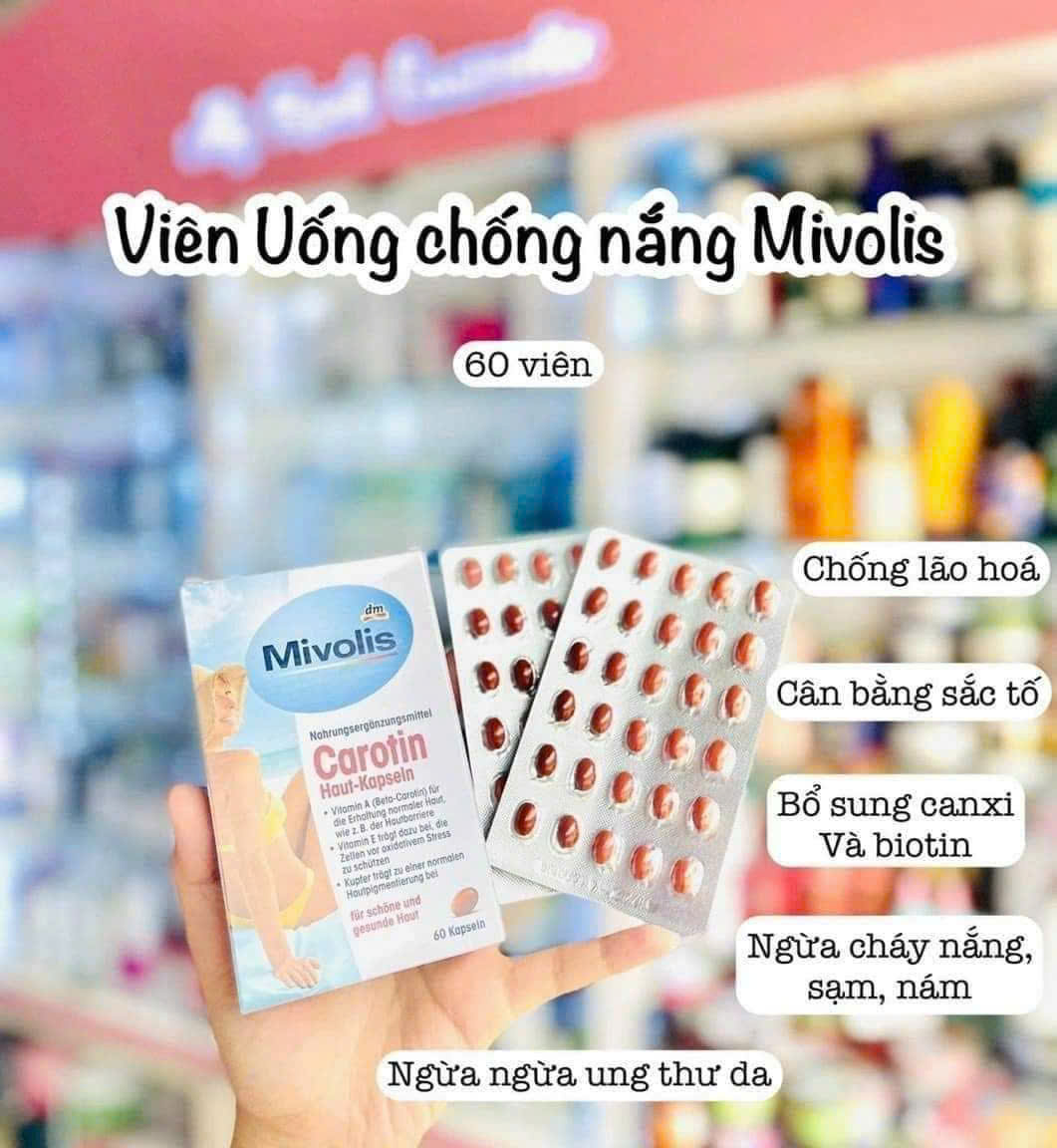 Viên uống chống nắng Mivolis Carotin đến từ Đức hiện đang được nhiều người tiêu dùng ưa chuộng. Với mức giá dao động từ 180.000 đến 230.000 VNĐ, đây là sản phẩm lý tưởng cho những ai muốn bảo vệ da khỏi tác hại của tia UV và bức xạ mặt trời. Thành phần của sản phẩm bao gồm beta-carotene, vitamin A, E, B2 cùng với nhiều chất dinh dưỡng khác, giúp làm sáng da và ngăn ngừa lão hóa.